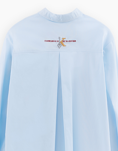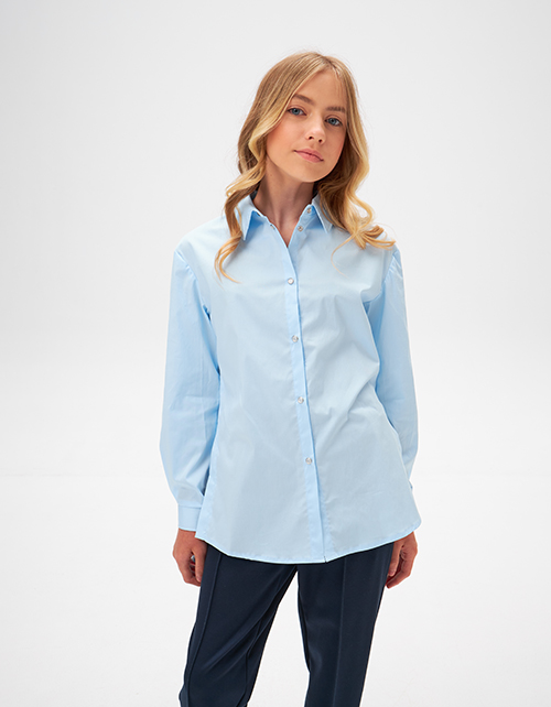 Светло-голубая школьная блузка А-образного силуэта. Удлинённая модель из поплина с разрезами в боковых швах. Изделие декорировано вышивкой.