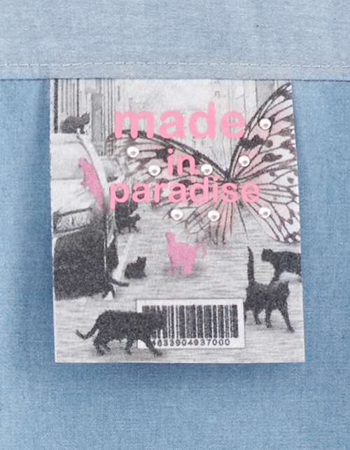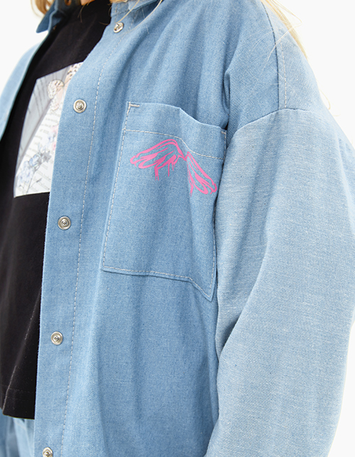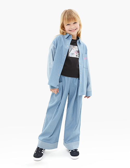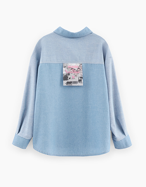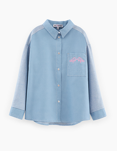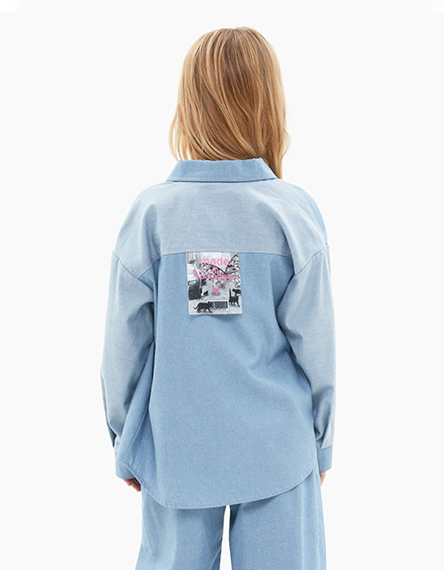 Джинсовая рубашка для девочки. Модель прямого расслабленного силуэта. Спущенная линия плеча. Накладной карман. Застёжка на металлические серебряные кнопки. Авторская лэйба со стразами под металл на спинке. Стильный образ с артикулами 241114 и 240108.
