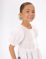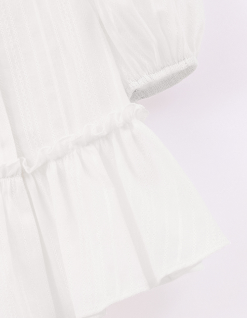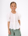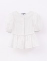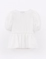 Молочная блузка из мягкой ткани - лёгкая и приятная к телу. Прямой крой с баской создаёт нежный рустик?образ и не мешает движению. Короткие рукава с мягкой лентой удобны в носке. Мережка добавляет деликатности. Потайная застёжка делает модель утончённой.