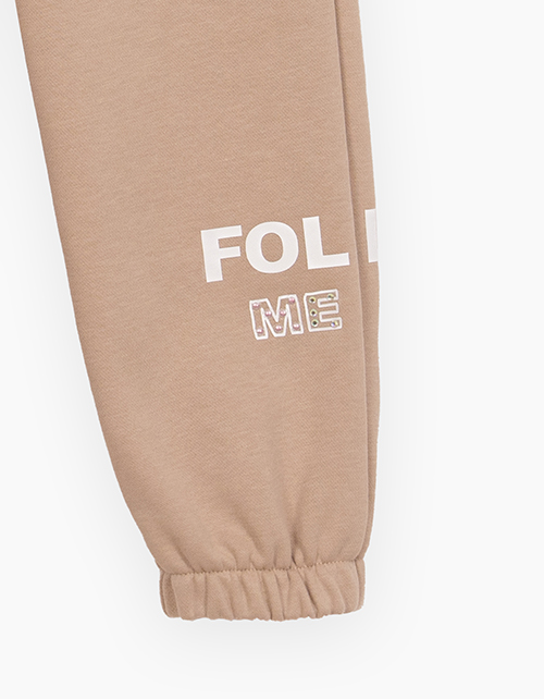 Базовые бежевые брюки-джоггеры для девочки. Прямая модель со средней посадкой. Изделие без застёжки, на мягком поясе. По низу удобные манжеты. Брюки с карманами-хулиганами. Модель декорирована стразами и авторской надписью.
