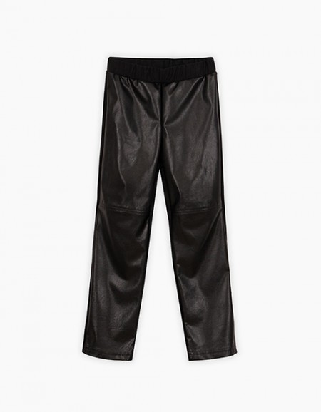 Стильные прямые брюки в тёплом бежевом оттенке для девочки. Зауженная модель со стрелками. Изделие на комфортном мягком поясе. Брюки из комбинации эко-кожи и футера.