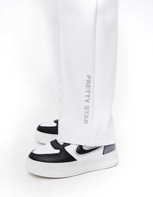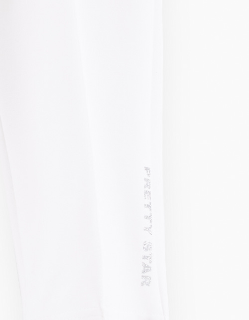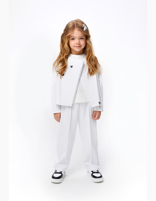 Брюки джерси оттенка молоко для девочки. Модель со строчками, прямого силуэта, со средней посадкой. Мягкий эластичный пояс. Деликатный декор в виде авторской трансферной печати. Стильный образ с артикулами 242201 и 242203.