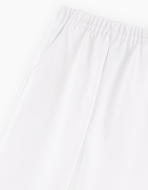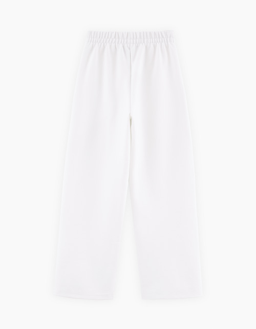 Брюки джерси оттенка молоко для девочки. Прямая широкая модель. Изделие на мягком эластичном поясе, со средней посадкой. Брюки дополнены карманами-хулиганами.