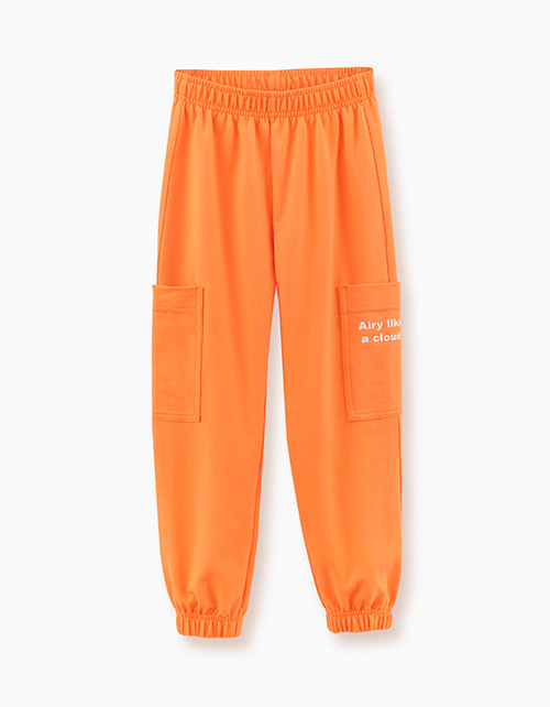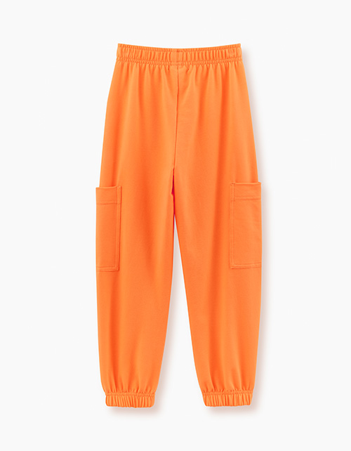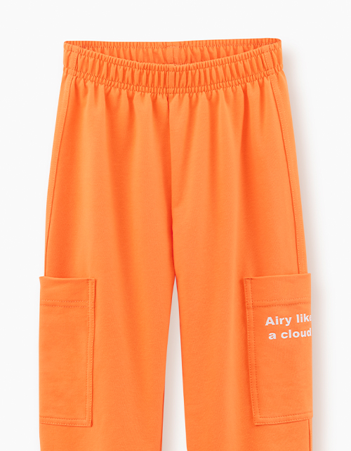 Модные брюки карго сочного оттенка райский мандарин для девочки. Прямая модель на резинке, средняя посадка. Брюки выполнены из футера с браш-эффектом.