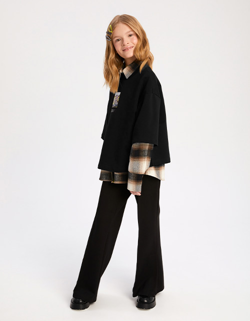 Чёрные брюки-клёш с разрезами внизу для девочки. Модель со средней посадкой. Изделие на эластичном поясе с регулировкой объёма. Брюки дополнены карманами в швах. Стильный образ с лонгсливом 252106 и свитшотом с коротким рукавом 252108.