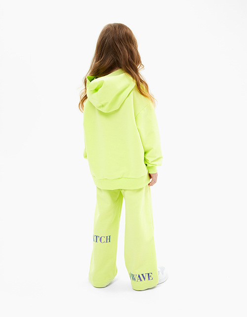 Широкие брюки оттенка киберлайм. Прямая модель. Изделие на мягком поясе со средней посадкой. Карманы хулиганы. Брюки из футера с бархатистым эффектом. Декорированы дизайнерским шрифтовым принтом. Декоративная плёнка меняет оттенок при разном освещении.