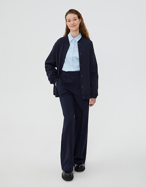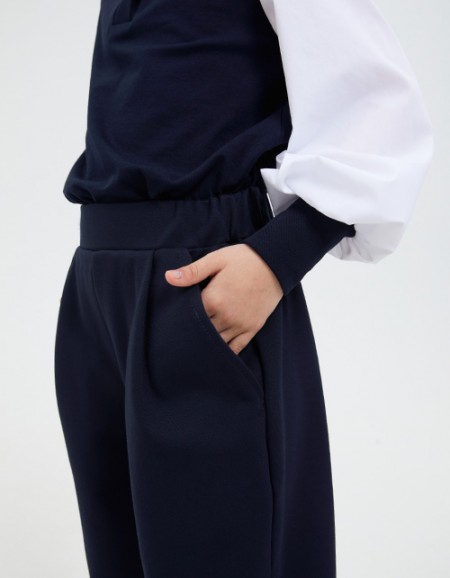 Широкие тёмно-синие школьные брюки для девочки. Модель из трикотажного полотна. Изделие со средней посадкой, на мягком поясе с регулировкой. Карманы в боковых швах. Брюки с защипами спереди.