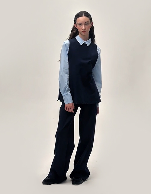 Широкие тёмно-синие школьные брюки для девочки. Модель из трикотажного полотна. Изделие со средней посадкой, на мягком поясе с регулировкой. Карманы в боковых швах. Брюки с защипами спереди.