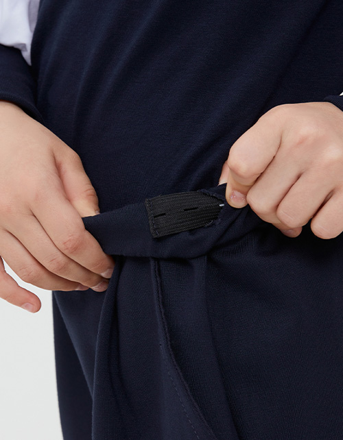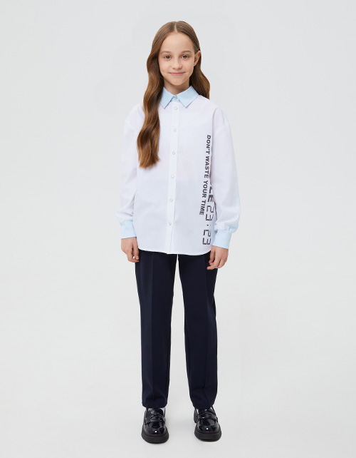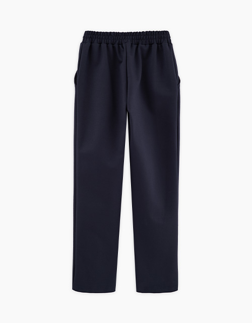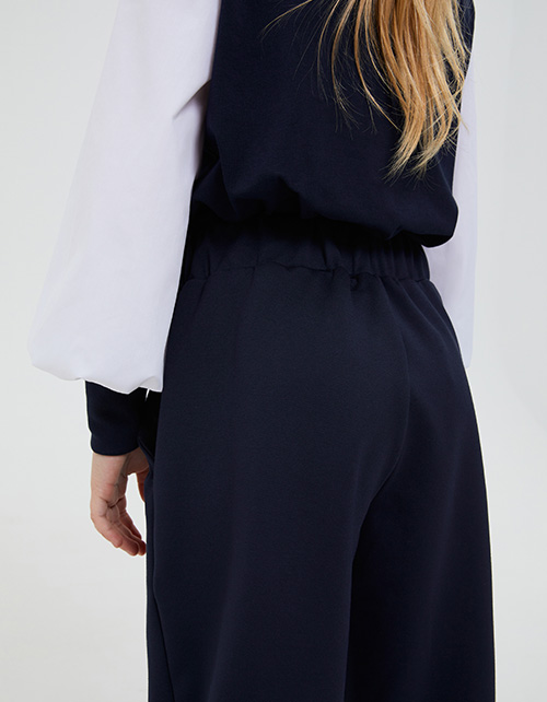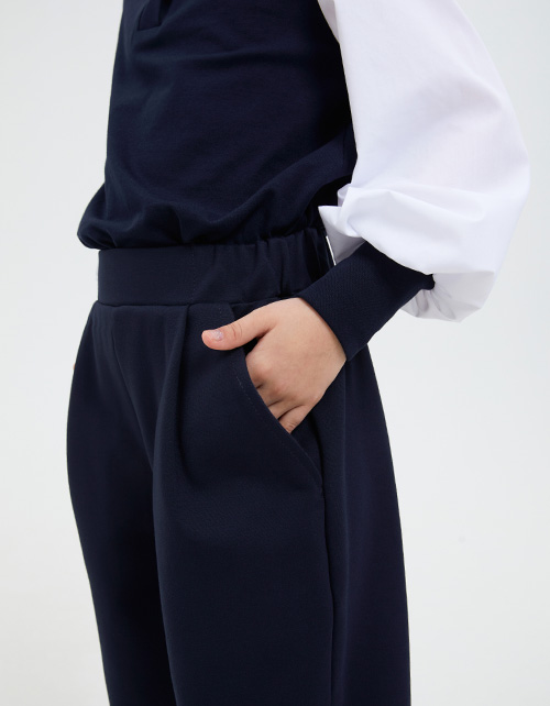 Зауженные к низу тёмно-синие школьные брюки для девочки. Укороченная модель из трикотажного полотна. Изделие со средней посадкой на мягком поясе с регулировкой. Карманы-хулиганы. Изделие со стрелками.