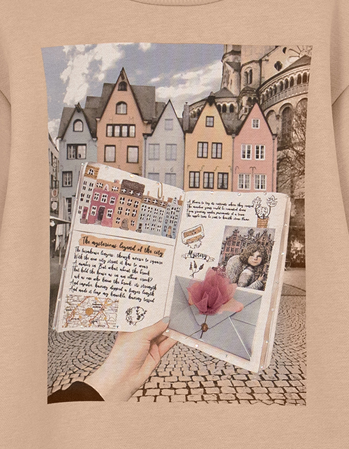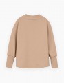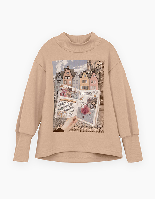 Оригинальный бежевый свитшот для девочки. Модель прямого силуэта со слегка удлинённой спинкой. Высокие манжеты и воротник-стойка из рибаны. Свитшот без застёжки. Декорирован стразами, авторским принтом и отлетным элементом из сеточки - цветком.