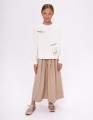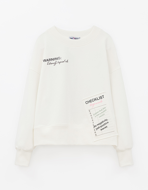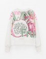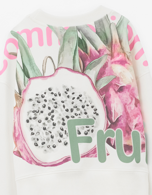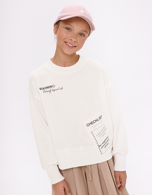 Молочный свитшот с объёмом по низу выделяется авторским принтом, расположенным на спинке, и аккуратными отделочными строчками. Высокая рибана формирует выразительный силуэт и хорошо держит форму, а мягкая отделка делает модель комфортной для подростка.