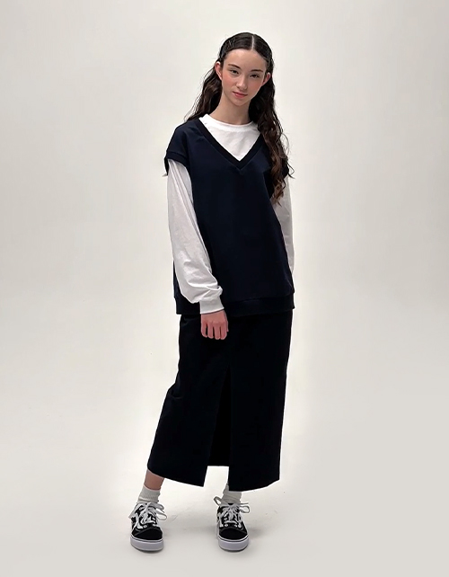 Джемпер-обманка для девочки. Модель расслабленного силуэта имитирует комплект из белого лонгслива и тёмно-синего жилета. Приспущенная линия плеча. Манжеты и низ изделия из мягкой эластичной рибаны. Небольшие сборки снизу рукава.