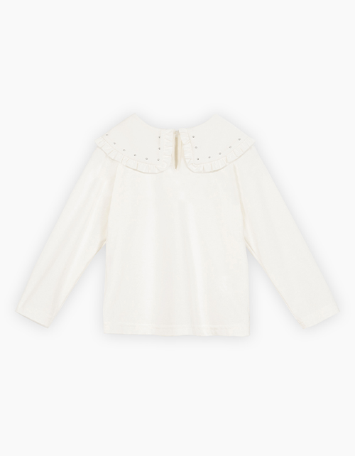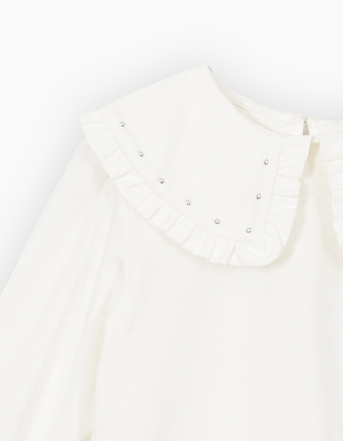 Романтичный лонгслив в молочном оттенке для девочки. Прямая модель. Застёжка на пуговицу. Изящный воротник с рюшей по краю декорирован стразами. Лонгслив интересно смотрится в паре с бомбером (арт. 232004).