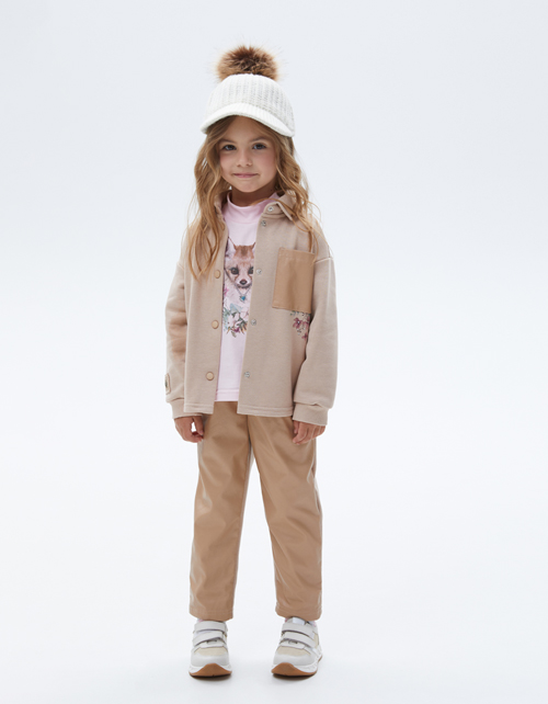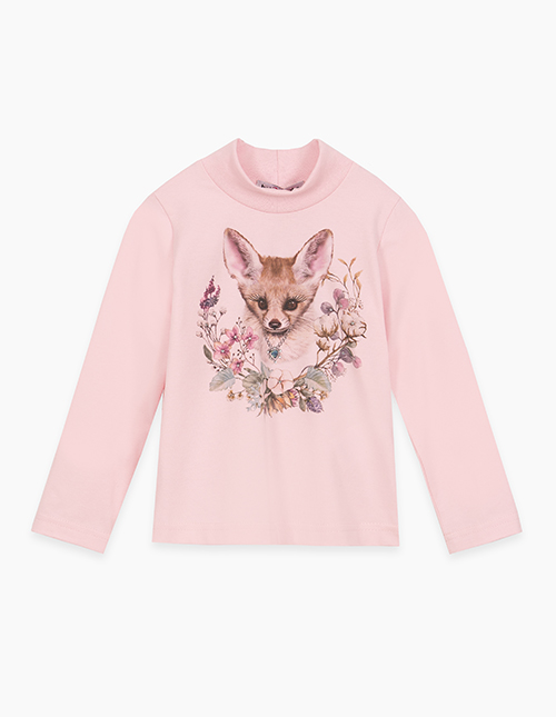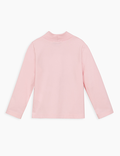Нежный светло-розовый лонгслив для девочки. Модель прямого силуэта. Изделие с воротником-стойкой из рибаны. Лонгслив декорирован стразами и авторским принтом.