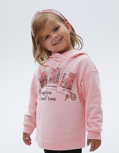 Нежное светло-розовое худи с капюшоном для девочки. Модель расслабленного удлинённого силуэта со спущенной линией плеча. Манжеты из рибаны. Худи выполнено из тактильно приятного футера с браш-эффектом. Модель декорирована стразами и авторским принтом.