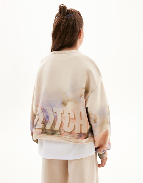 Комфортный свитшот оттенка экрю для девочки. Прямая объёмная модель. Спущенная линия плеча. Эластичная горловина. Свитшот из материала с бархатистым эффектом. Модель с эффектным авторским принтом.