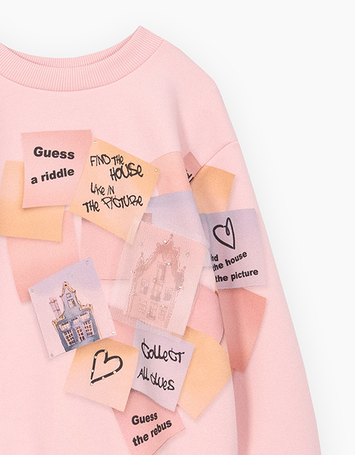 Свитшот нежного светло-розового оттенка для девочки. Модель прямого объёмного силуэта. Манжеты, низ и горловина изделия из рибаны. Свитшот из мягкого и бархатистого футера. Декорирован стразами, авторским принтом и отлетными элементами из сеточки.