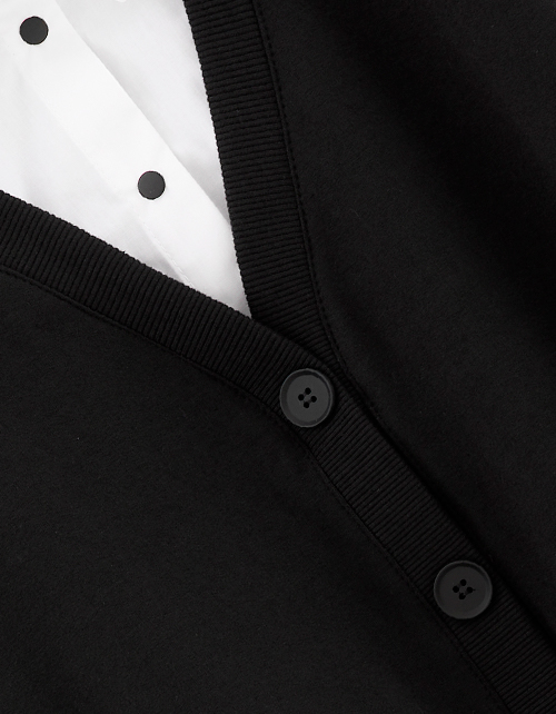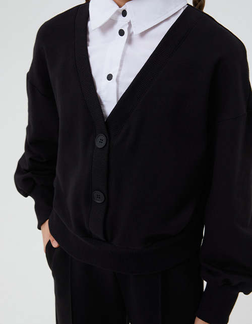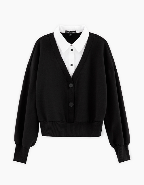 Укороченный джемпер-обманка для девочки. Модель прямого силуэта. Слегка спущенная линия плеча. Имитирует комплект из белой блузы и чёрного кардигана с декоративной застёжкой на пуговицы. Выполнен из футера и сорочечной ткани. Удобная застежка на кнопки.