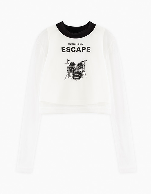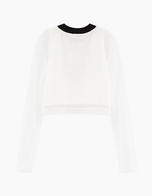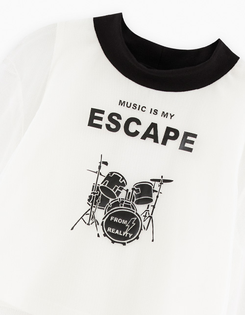 Укороченный лонгслив в оттенке молоко для девочки. Модель прилегающего силуэта. Воротник-стойка из эластичной рибаны. Комбинация материалов: кулирная гладь и нежное сетчатое полотно. Лонгслив декорирован авторской печатью.