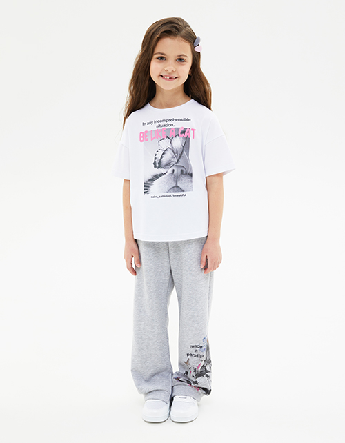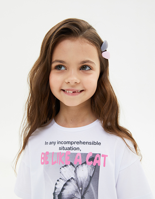 Белая футболка с дизайнерским принтом для девочки. Модель прямого силуэта. Эластичная горловина из рибаны. Спущенная линия плеча. Футболка декорирована стразами.