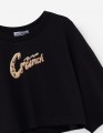 Чёрная укороченная футболка с oversize посадкой создаёт расслабленный, современный образ. Прямой крой остаётся удобным в движении. Принт с DTF и трансферной плёнкой добавляет выразительный акцент и подчёркивает характер модели.