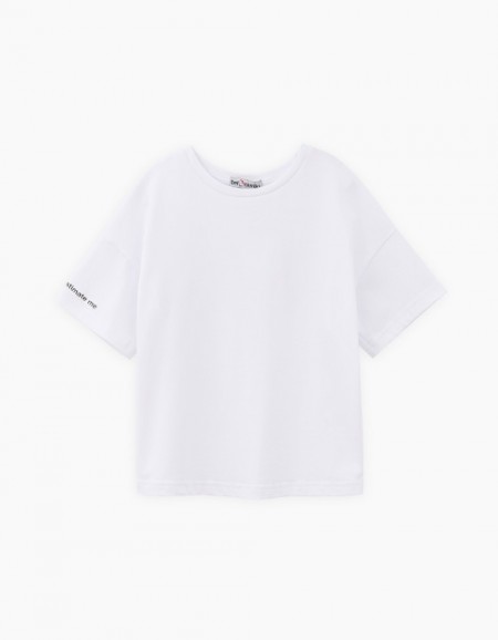 Белая футболка для девочки. Прямой силуэт обеспечивает комфорт. Короткий приспущенный рукав добавляет расслабленности. Эластичная горловина из рибаны мягко прилегает. Цифровой принт декорирован стразами, создавая яркий акцент.