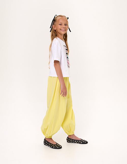 Укороченная футболка в белом цвете с лёгким объёмом и аккуратным прямым силуэтом. Акцент - жемчужный декор и отлётные банты, создающие нарядный, игривый эффект. Мягкий хлопковый трикотаж делает модель комфортной и приятной к телу.
