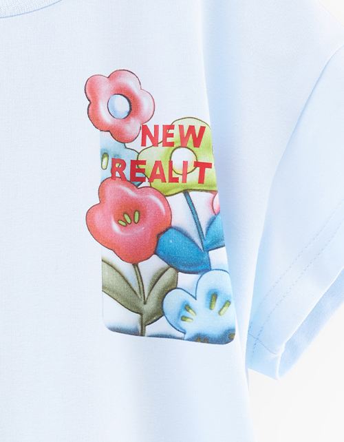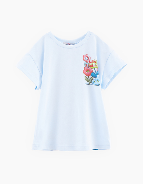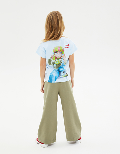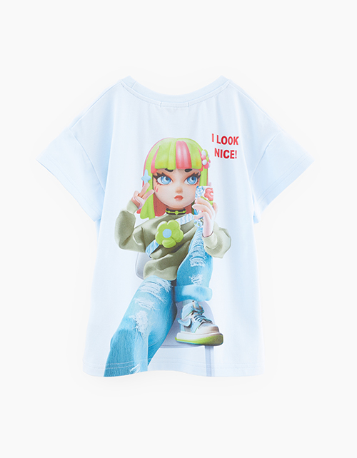 Футболка небесно-голубого оттенка для девочки. Модель прямого силуэта. Приспущенная линия плеча. Эластичная горловина из рибаны. Футболка декорирована авторскими принтами: небольшим спереди и акцентным на спинке.