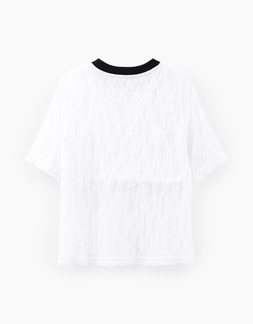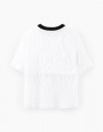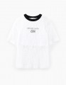 Белый кроп-топ из мягкого хлопка сочетается с лёгкой кружевной футболкой, создавая многослойный, современный образ. Прямой крой делает модель комфортной и актуальной. Авторский цифровой принт добавляет аккуратный акцент и подчёркивает стиль.
