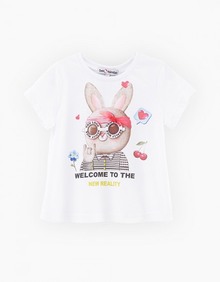 Нарядная футболка для девочки. Прямая модель с коротким рукавом. Рукав со сборкой, создающей лёгкий объём. Горловина обработана эластичной рибаной. Декорирована цифровым принтом, стразами и отлётным элементом. Выполнена из кулирной глади.