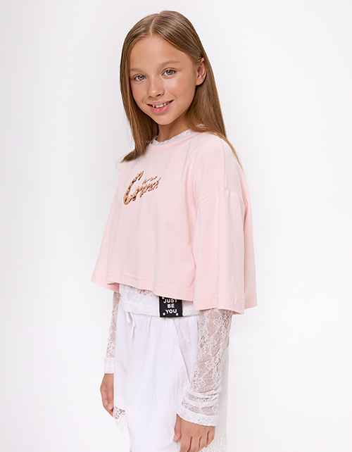 Пудрово-розовая укороченная футболка с oversize посадкой создаёт расслабленный, современный образ. Прямой крой остаётся удобным в движении. Принт с DTF и трансферной плёнкой добавляет выразительный акцент и подчёркивает характер модели.