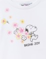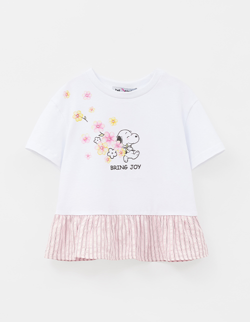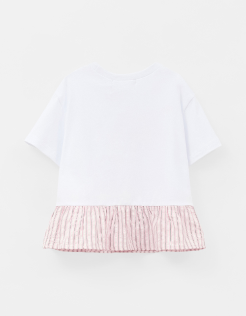 Белая блузка с лёгким oversize создаёт воздушный образ. Прямой верх из мягкого хлопка сочетается с баской из поплина, добавляя объёма и движения. Приспущенная линия плеча делает посадку расслабленной. Авторский принт со стразами добавляет нежный акцент.