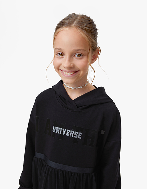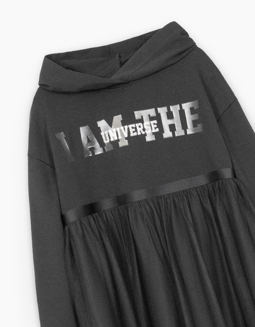 Чёрное нарядное удлинённое платье для девочки. Комфортная трапециевидная модель с капюшоном. Длинный рукав со спущенной линией плеча, низ из рибаны. Изделие из комбинации материалов: футер и сетчатое полотно. Платье с дизайнерским шрифтовым принтом.