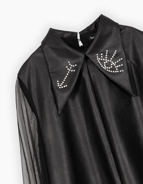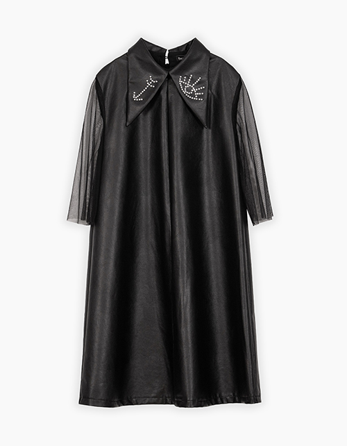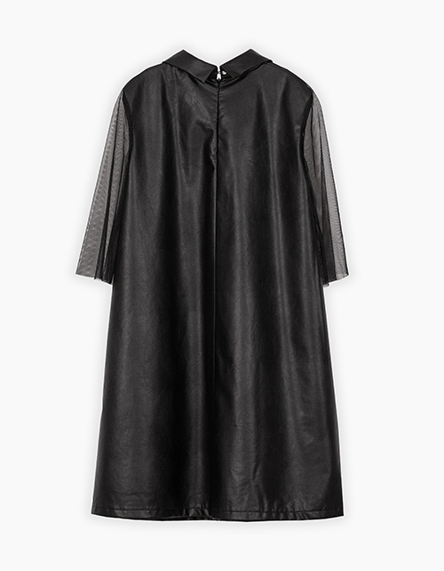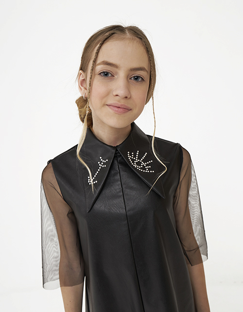 Стильное чёрное платье из эко-кожи для девочки. Комфортный трапециевидный силуэт. Длина до колена. Рукава из сетчатого полотна. Удобная застёжка на потайную молнию и пуговицу. Отложной воротник, декорированный трансферами из страз (око, стрелка).