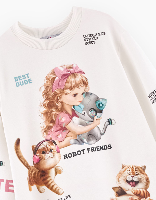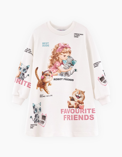 Дизайнерское платье оттенка молоко для девочки. Модель комфортного А-образного силуэта, сзади дополнительный романтичный волан. Приспущенная линия плеча. Горловина и манжеты из рибаны. Платье полностью декорировано авторскими принтами.