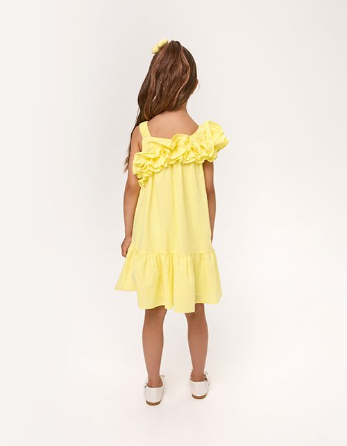 Платье в светло-жёлтом оттенке с А-образным силуэтом и асимметричной линией создаёт лёгкий, воздушный образ. Бретели подчёркивают открытый верх, а жатый поплин добавляет фактуру. Модель на подкладке, что делает посадку аккуратной и комфортной.