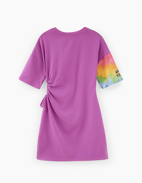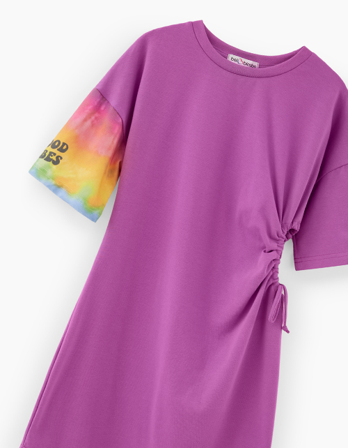 Комфортное платье насыщенного оттенка ирисовая орхидея. Модель прямого силуэта (с возможностью утяжки до приталенного). Изделие из кулирной глади с декоративным вырезом с регулировкой. Рукав платья ассиметрично декорирован авторским принтом.