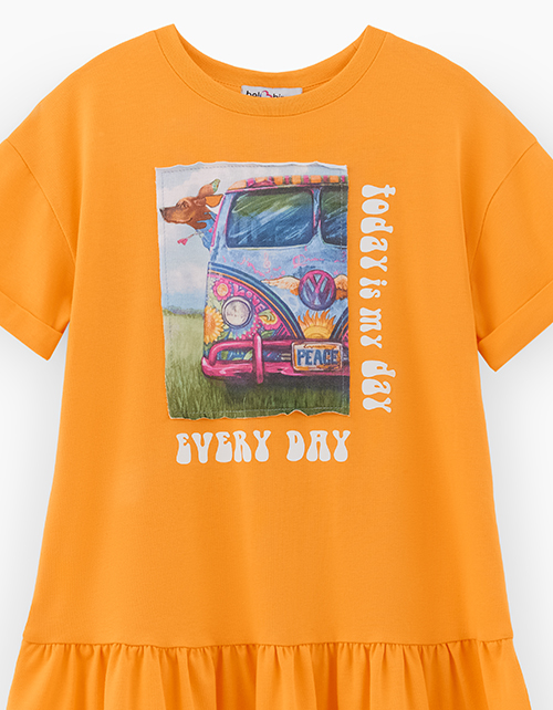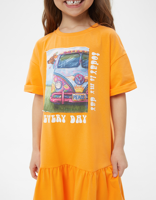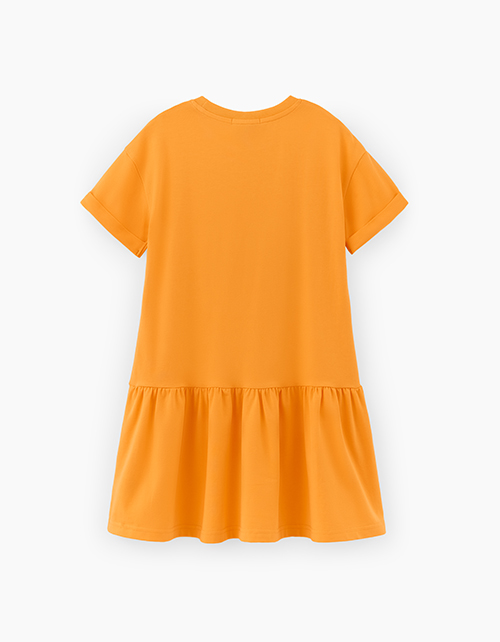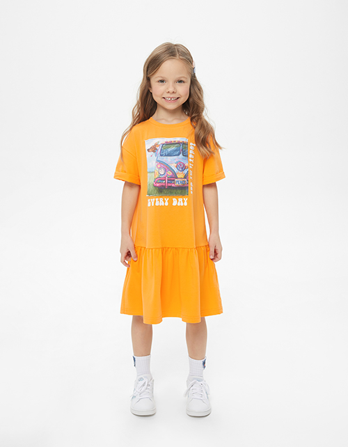 Базовое летнее платье сочного оттенка маракуйя для девочки. Модель комфортного А-образного силуэта со спущенной линией плеча. Изделие из кулирной глади. Платье с нашивным элементом в стиле коллекции.