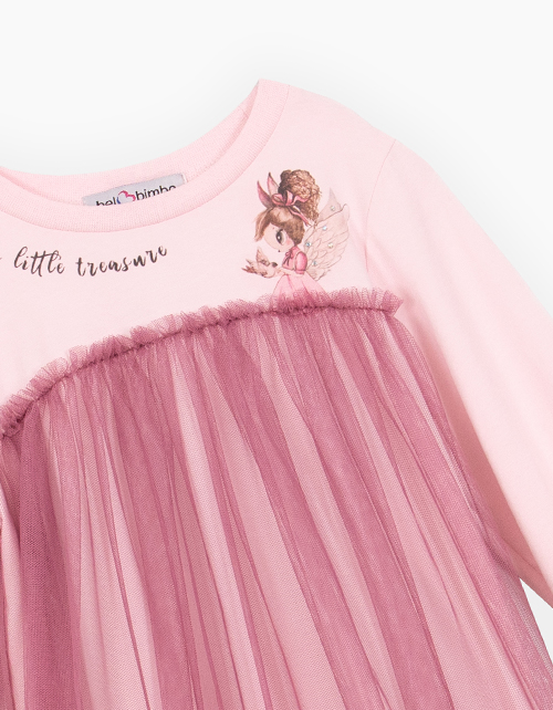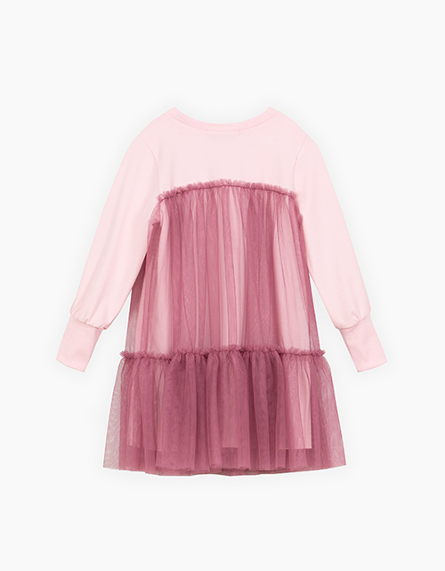 Романтичное платье с длинным рукавом для девочки. Игра цветов на оттенках розового. Модель комфортного А-образного силуэта с высокими манжетами. Платье из комбинации материалов: кулирная гладь и сетчатое полотно. Альтернатива комплекту из лонгслива и юбки