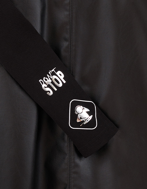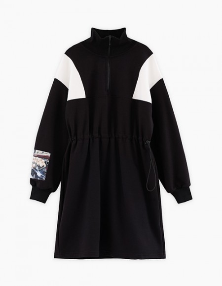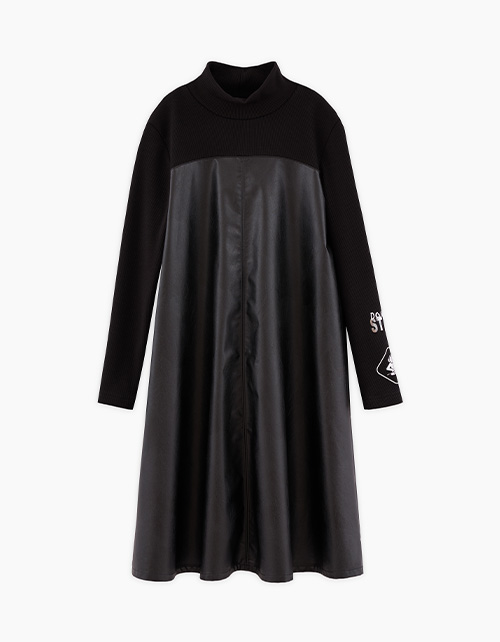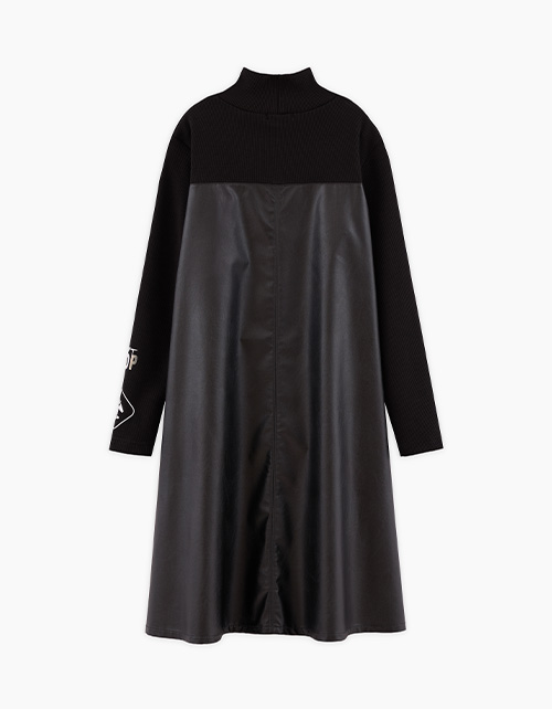 Стильное чёрное платье для девочки. Комфортный А-образный силуэт. Спущенная линия плеча. Воротник-стойка. Имитация комплекта гольфа из рибаны в рубчик и сарафана из эко-кожи. Лаконичный авторский декор.