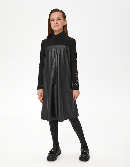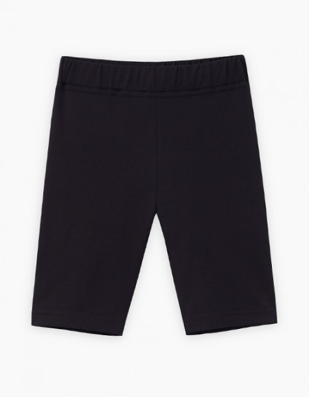 Чёрная юбка-шорты для девочки. Спереди: трапециевидная модель, сзади: прямые шорты. Изделие со средней посадкой, на мягком эластичном поясе. Модель декорирована бантиком.