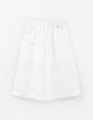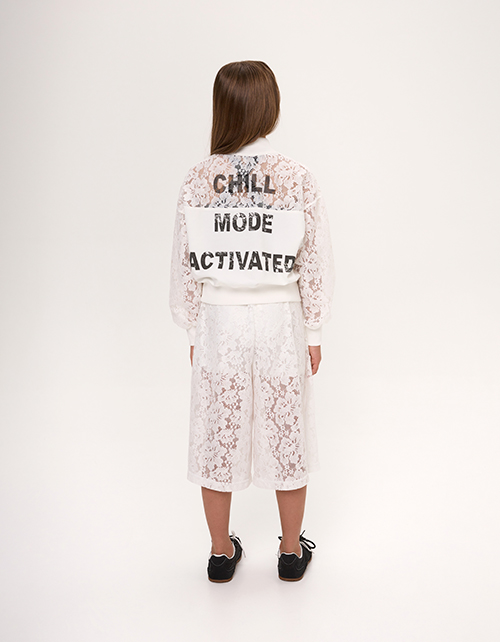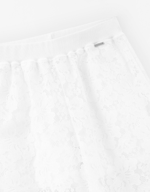 Широкие прямые шорты-бермуды в молочном оттенке из кружевного полотна создают лёгкий, выразительный силуэт. Внутренние хлопковые велосипедки обеспечивают комфорт и уверенность в движении. Металлическая нашивка добавляет аккуратный акцент.