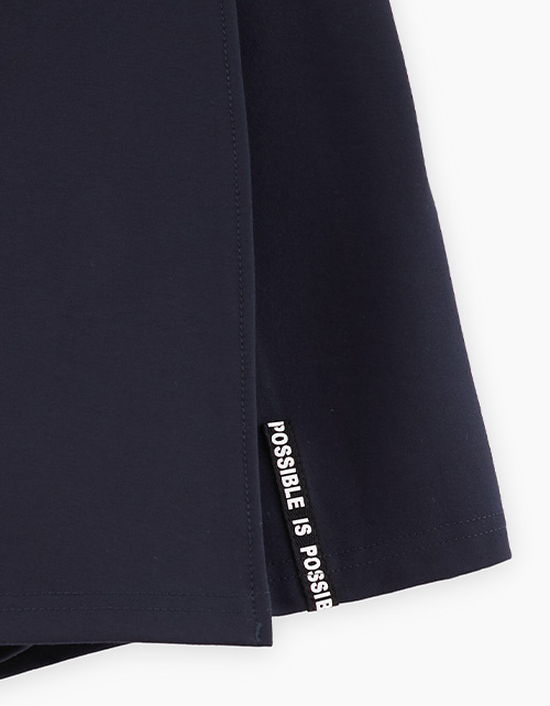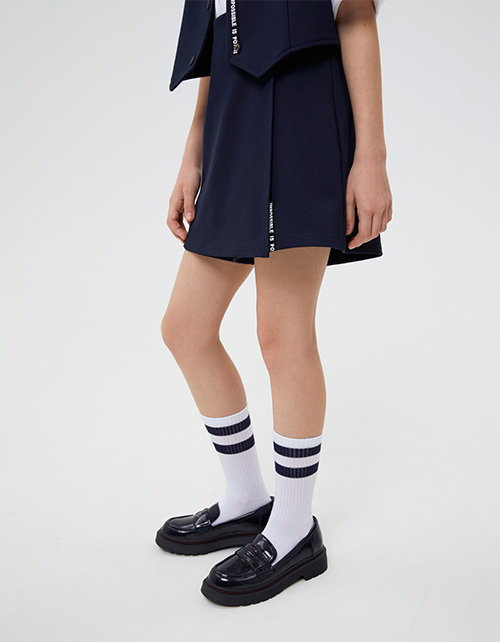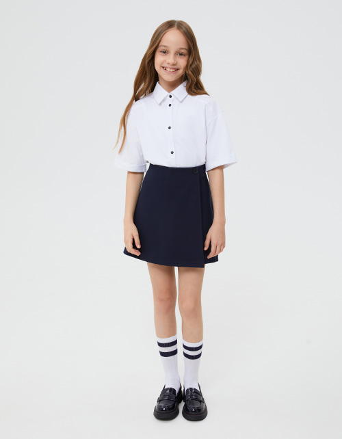 Тёмно-синяя школьная юбка-шорты для девочки. Спереди: А-образная модель с имитацией запаха, сзади: прямые шорты. Изделие на мягком поясе (внутри с резинкой), декорированным пуговицей. Шрифтовой декор спрятан под запахом, виден при движении.