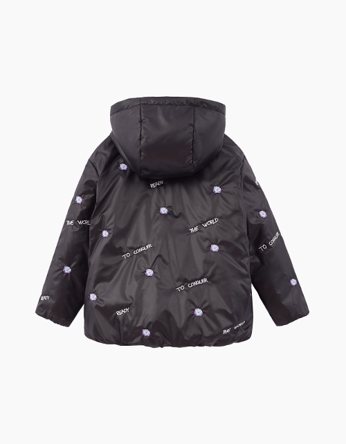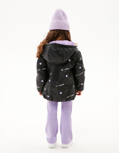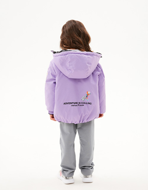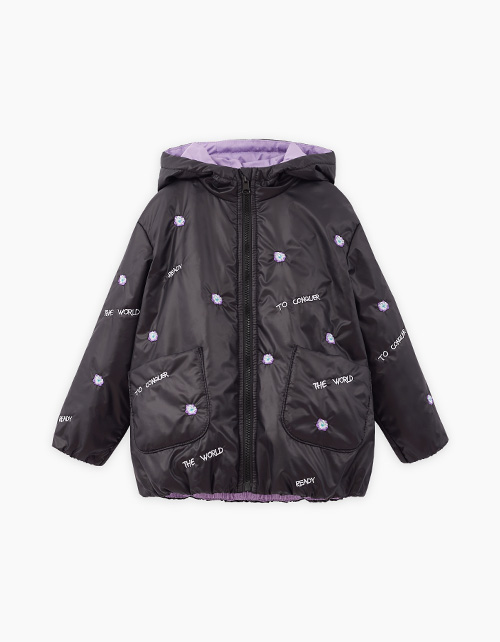 Объёмная модель. Спущенная линия плеча. Манжеты и низ изделия на мягкой резинке. Лиловая сторона декорирована авторскими принтами, чёрная - дизайнерской вышивкой. Рекомендуемая температура: +5:+15, в зависимости от второго слоя и особенностей ребёнка.