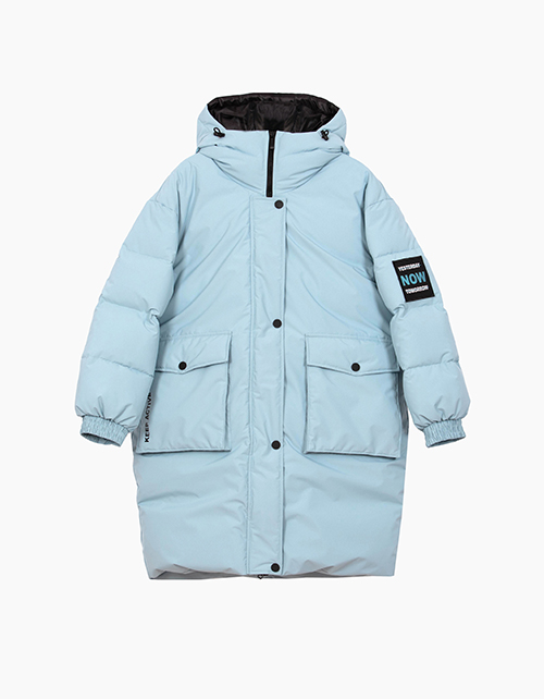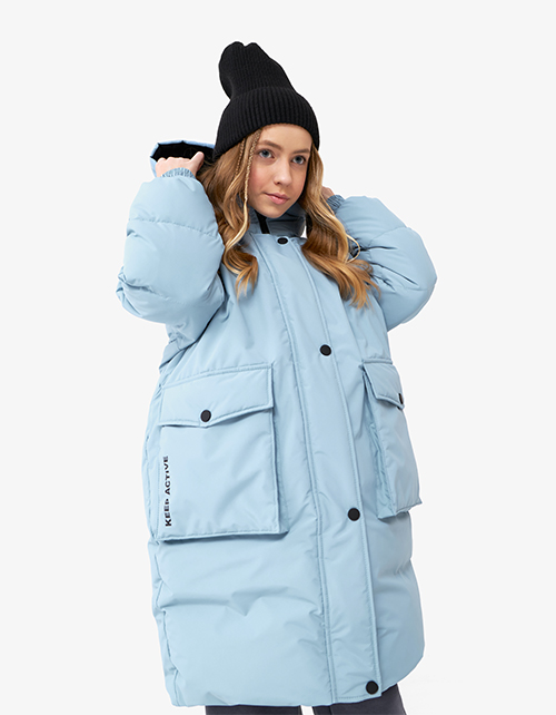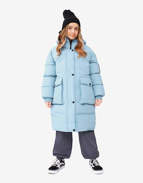 Зимнее пальто на гипоаллергенном синтепухе. Матовая ткань в оттенке лёд. Ветрозащитная планка на кнопках. Мягкие трикотажные манжеты по внутреннему воротнику и рукавам. Подкладка из нейлона. Нашивка-лейбл, декор на подкладке и модная стежка на спинке.