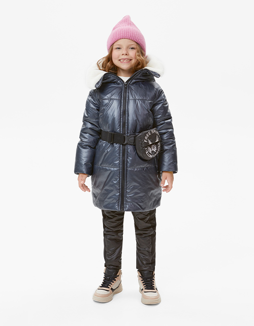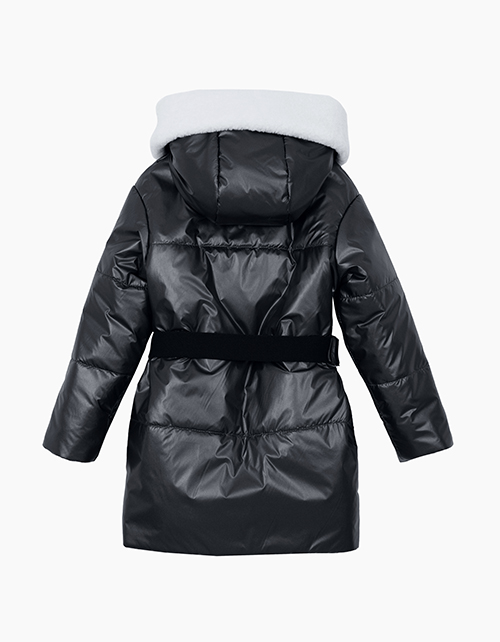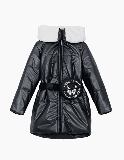 Стильная зимняя чёрная куртка. Модель на молнии. Мягкие трикотажные манжеты по внутреннему воротнику и рукавам. Комбинированная подкладка из флиса и нейлона. Наполнитель: силиконизированный синтепон. Капюшон с меховой отделкой. Стильная сумочка на поясе.