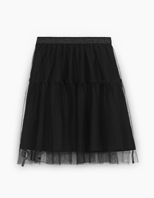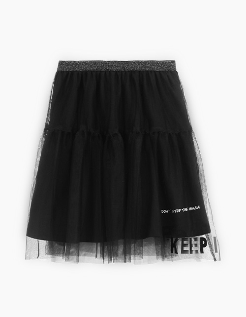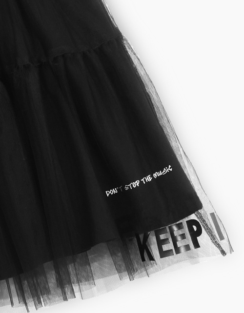 Чёрная юбка для девочки. Модель летящего трапециевидного силуэта. Изделие на мягкой эластичной ленте с люрексом. Комбинация материалов: кулирная гладь и мягкое сетчатое полотно. Декорирована авторским слоганом.