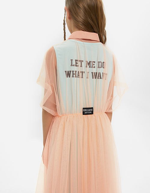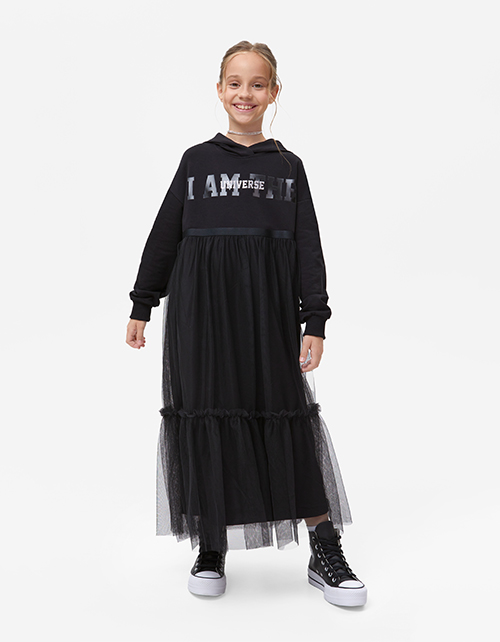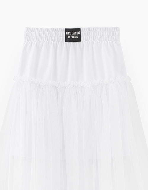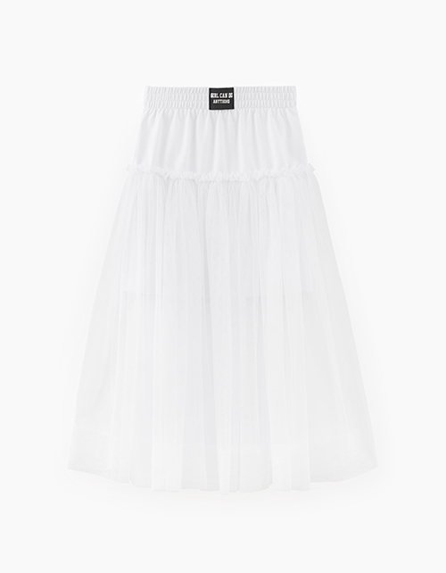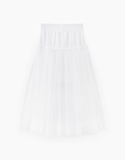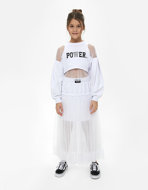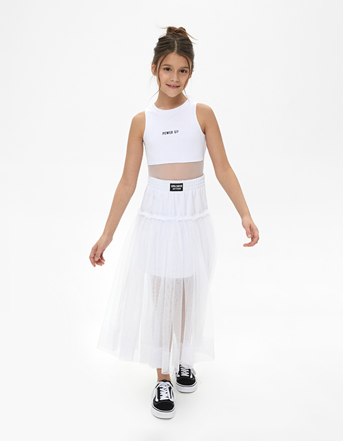 Пышная белая юбка-пачка для девочки. Модель комфортного А-образного силуэта со средней посадкой. Изделие из футера и сетчатого полотна. Юбка двойная: снизу - укороченная узкая, сверху - широкая, в сборку. Изделие с нашивной жаккардовой лэйбой.
