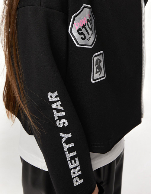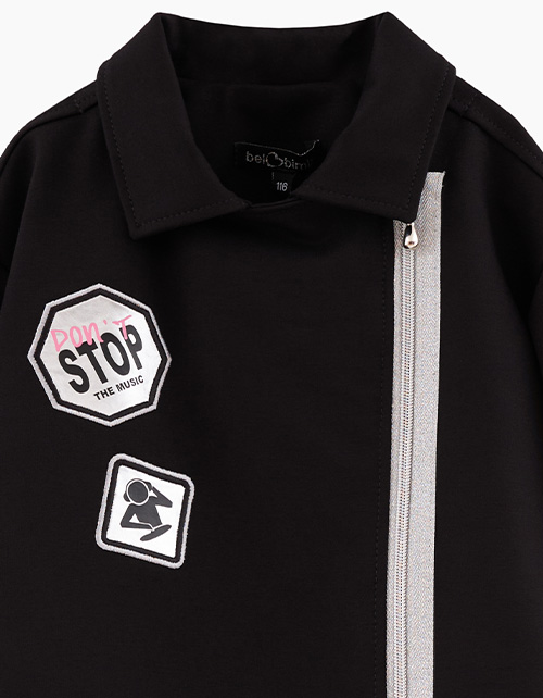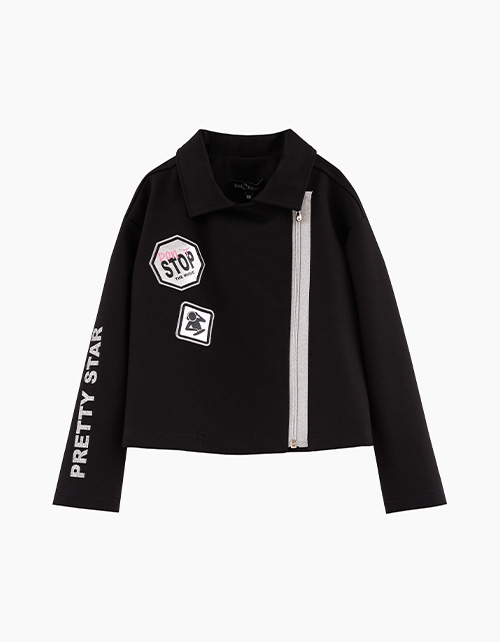Дизайнерский брутальный чёрный жакет-косуха для девочки. Модель прямого силуэта, с отложным воротником. Застёжка на молнию. Жакет декорирован рукотворной плёнкой и вышивками, авторскими шрифтовыми печатями.