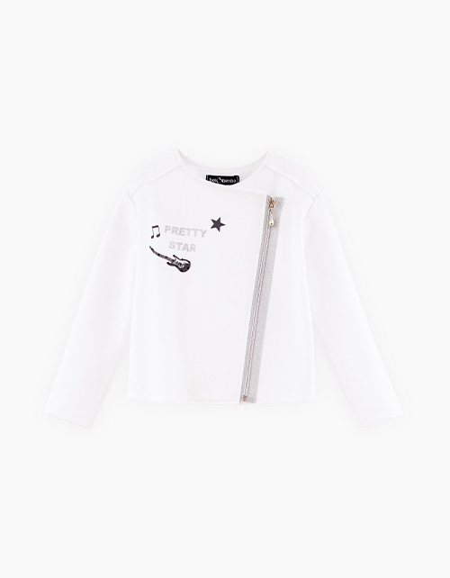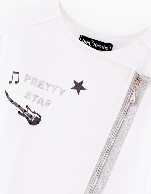 Стильный жакет-косуха молочного оттенка для девочки. Модель прямого силуэта. Застёжка на молнию. Жакет декорирован стразами и авторскими принтами: деликатным спереди и акцентным на спинке. Гармоничная пара с артикулами 242203 и 242204.